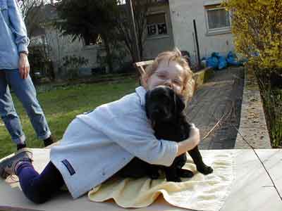 Carolin schaukelnd mit Welpen, den es allerdings zur Milchbar zieht