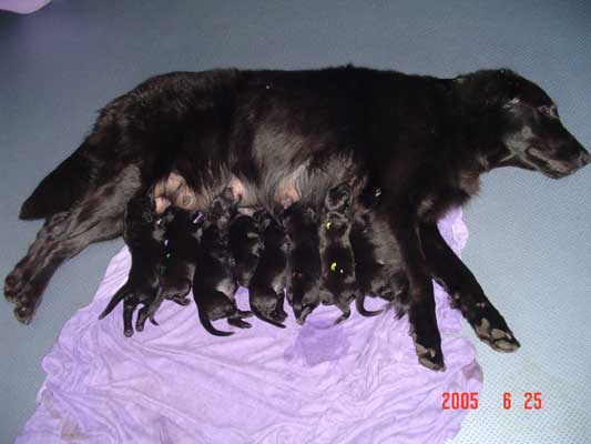 Am 20.06.05 brachte Janni 11 gesunde schwarze Flatwelpen zur Welt! Wir freuen uns!