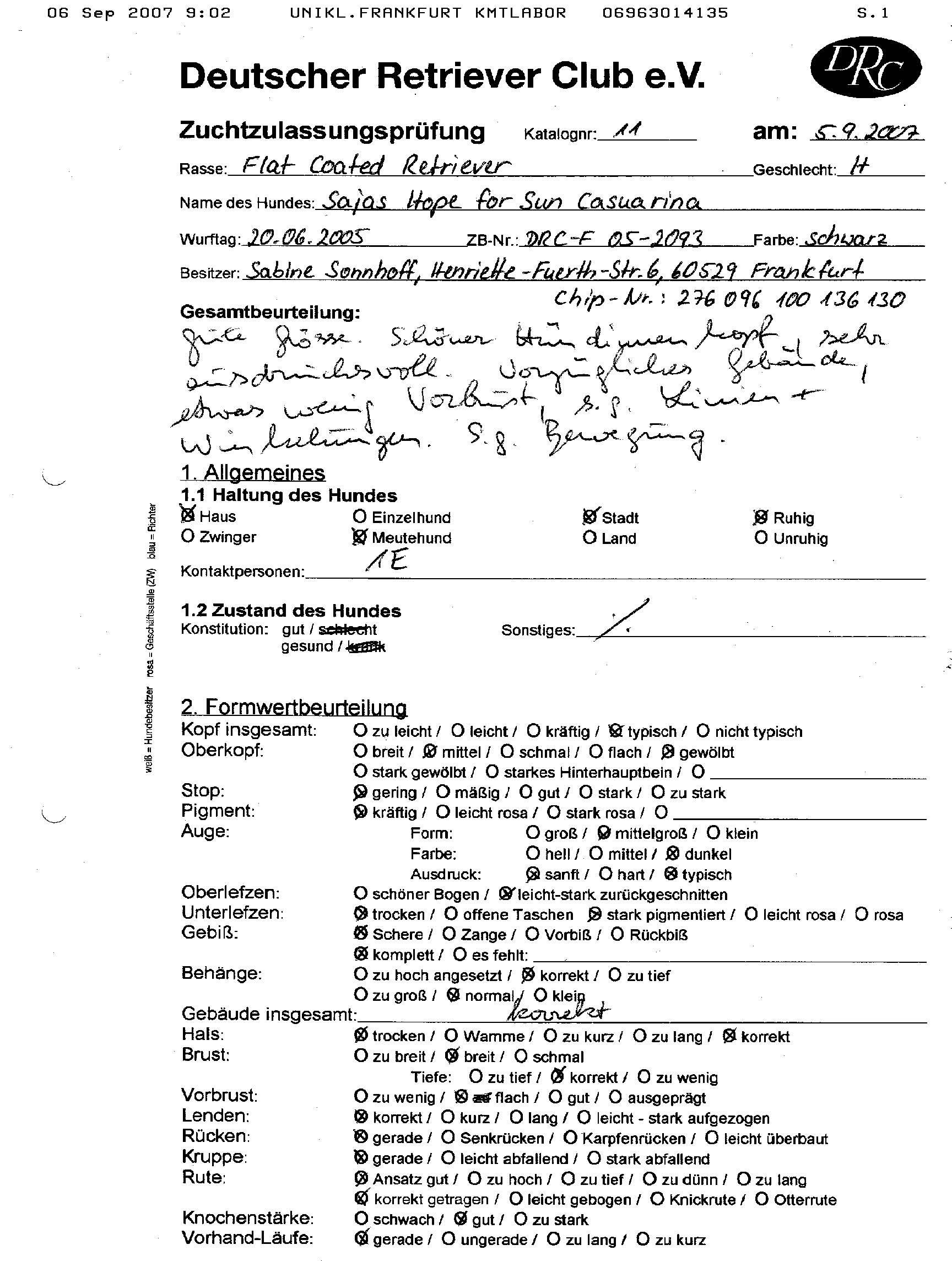Die 9 Monate alte Flathündin zeigt einen stark ausgeprägten Spieltrieb. Sie hat einen hochentwickelten Bewegungs- und Betätigungstrieb. Im gesamten Testverlauf verhielt sie sich ausdauernd und aufmerksam. Sie zeigte körperliche Härte. Ihre jagdlichen Anlagen sind in stark ausgeprägter Form sichtbar geworden. Ihre Unterordnungsbereitschaft und Bindung sind gut. Im Kontakt mit Fremdpersonen absolut freundlich und sicher. Ebenso im Kreis und in der Rückelage. Optisch und akustisch ist die Hündin voll belastbar. Die Hündin ist schussfest.