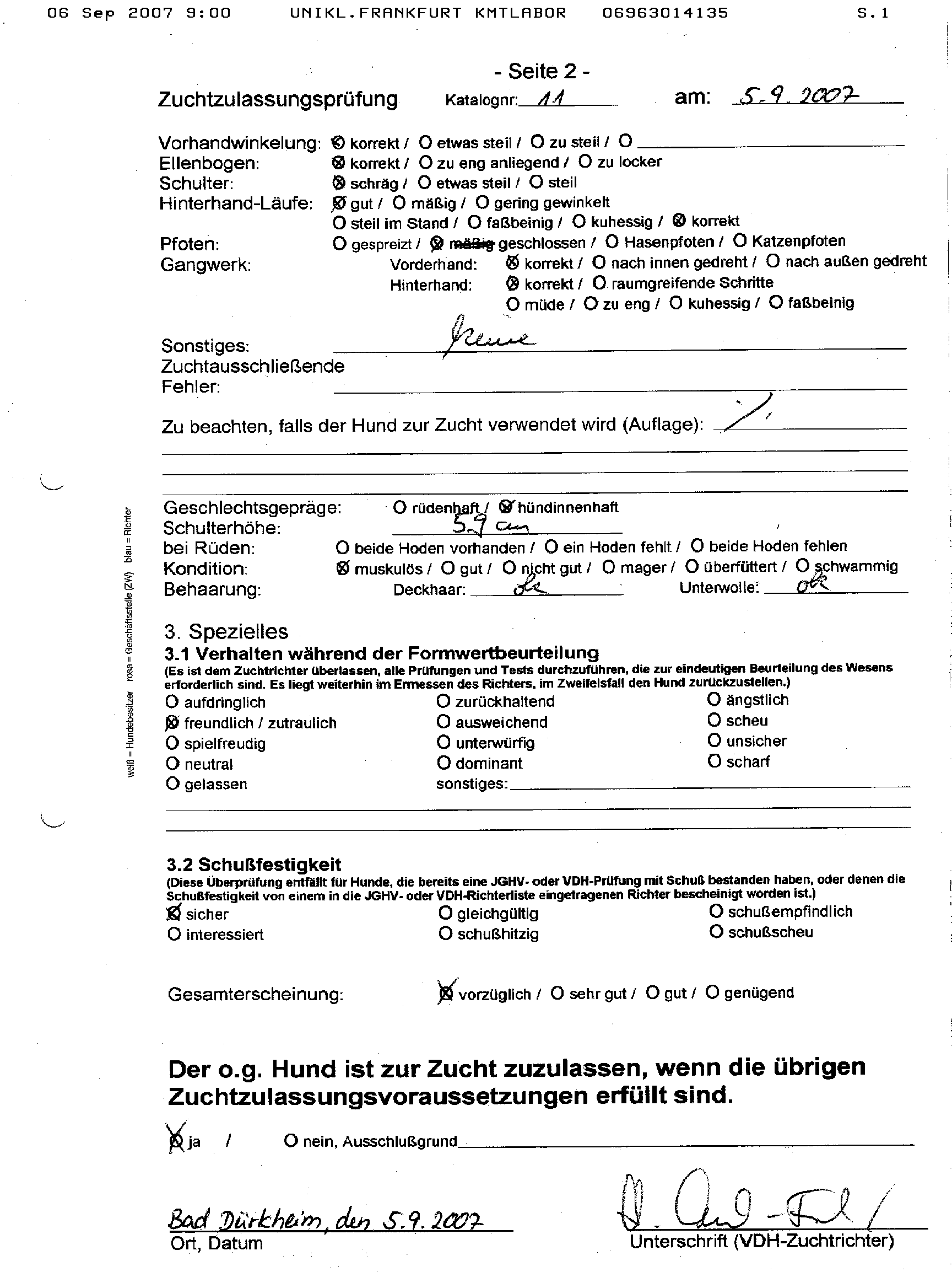 "Gute Größe, schöner Hündinnenkopf, sehr ausdrucksvoll, vorzügliches Gebäude, etwas wenig Vorbrust, sehr gute Linien und Winkelungen, sehr gute Bewegung"