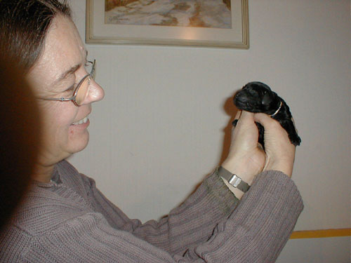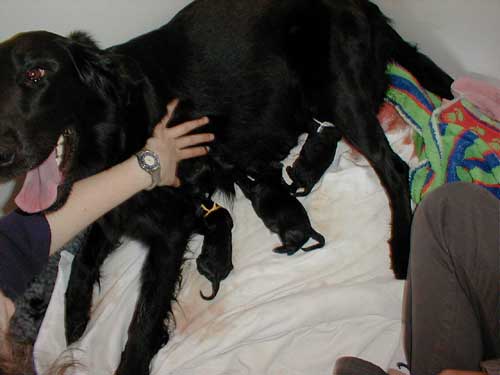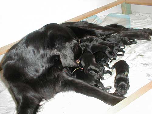 Am Sonntag, den 3. Februar 2002 war es dann endlich soweit: Janni warf 11 schwarze Flatwelpen! Alles sind gesund und sehr munter! Die Geburt verlief ohne Probleme. Nachdem die erste Hündin als schwerste den Weg geebnet hatte, kamen die nächsten beiden sehr schnell heraus. Zwischenzeitlich ließ Janni sich ein paar Verschnaufpausen, so daß wir bei 9 Welpen bereits annahmen, es seien alle auf der Welt. Das Röntgenbild beim Tierarzt belehrte uns und zeigte, daß noch 2 darauf warteten, das Licht der Welt zu erblicken...die zu Hause angekommen auch bald kamen.