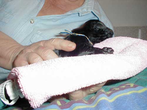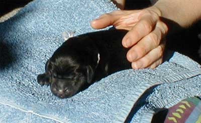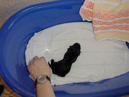 Er wird kräftig gerubbelt bis er den ersten Welpenschrei von sich gibt.