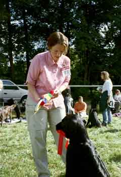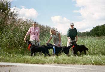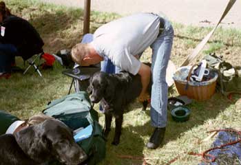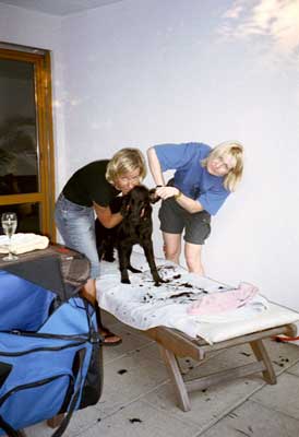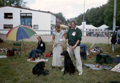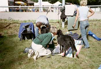 Während gerade die Rüden offene Klasse gerichtet wurden, kehrten Uschi mit Dira und Nanette mit Amy von einem "Entspannungsspaziergang" zurück: Die beiden Flat-Mädels fanden ein Schlammloch und suhlten sich darin! Nun war schnellste Putz-und Schlammbeseitigungsarbeit zu leisten, da als nächstes unsere Kleinen an der Reihe waren-an dieser Stelle ein Dank an die Handtuchspender(Uli und Carolin)! :-)