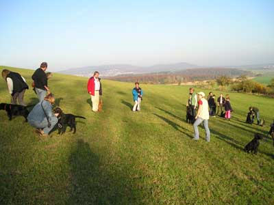 Anschließend gab es einen kurzen theoretischen Einblick in die Dummyarbeit und die großen Flats Amy, Balou, Lana und Mama Janni zeigten u.a. was eine Markierung vom Einweisen und von der Suche unterscheidet.